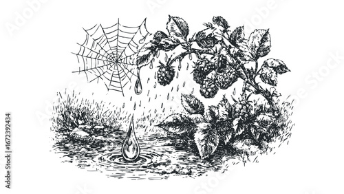 © Bravo, Naklejka premium Raindrops falling on raspberry plant and spider web with ripples. Vector hand drawn illustration