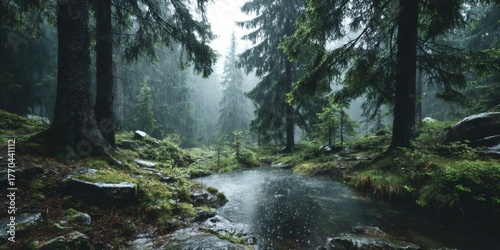 © ArtPixel-Portfolio, Obraz premium Raindrops falling on water in dark spruce forest during heavy downpour, creating moody natural atmosphere