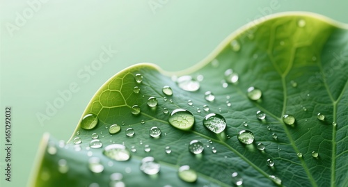 Fototapeta premium Raindrops glimmering on green leaf nature close-up photography fresh environment