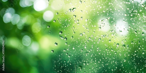 Fototapeta premium Raindrops glistening on a blurred mirror with a vibrant green garden backdrop...