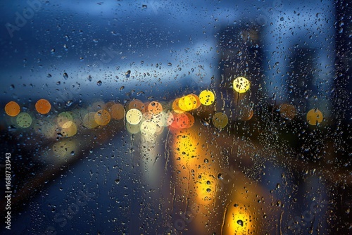 Obraz premium Raindrops on a window, night city lights blurred