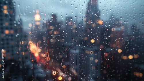 © Valentyna, Fototapeta premium Raindrops on a window with a blurred cityscape in the background