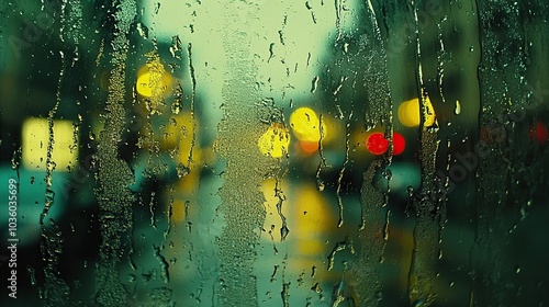 © arsyi_06, Obraz premium Raindrops on a window with blurred city lights.