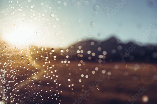Obraz premium Raindrops On Car's Wind Shield On The Mountains And Sun, Selective Focus....