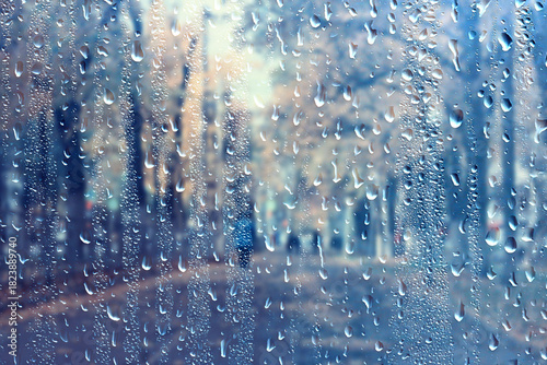 Obraz premium raindrops on glass blurred autumn background trees in the park, seasonal...