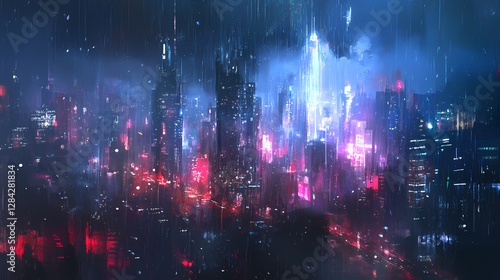 Fototapeta premium Raindrops on glass creating an ethereal effect with a cityscape backdrop. Ethereal City Skyline. Illustration