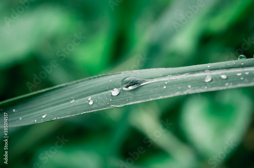 Obraz premium Raindrops on leaf. Rain drop on Leaves. Extreme Close up of rain water dew droplets on blade of grass. Sunlight reflection. Winter rainy season. Beauty in nature abstract background. Macro photography