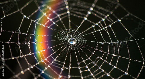 © Lahiru, Fototapeta premium Raindrops on Spiderweb with Rainbow Reflections
