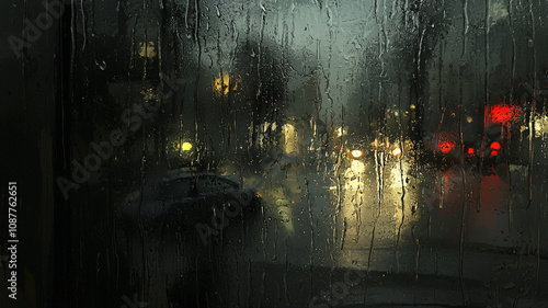 © Nadюshes , Naklejka premium Raindrops on the dark glass of public transport.