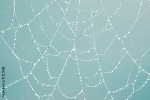 © Ismael, Fototapeta premium raindrops on the spider web in rainy days, blue background