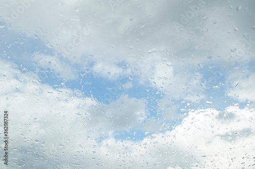 Fototapeta premium Raindrops on the window glass. Clear blue sky with white clouds. Blurred background.