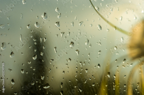 © Wingedbull, Naklejka premium raindrops on window glass on background of cloudy sky