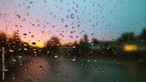 Fototapeta premium Raindrops on Windowpane with Sunset Reflections Creating a Dreamy Atmosphere