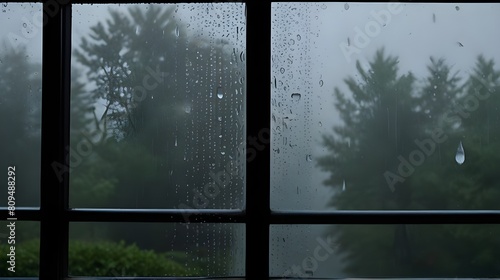 Naklejka premium Raindrops sliding down a foggy glass window, distorting the view outsid