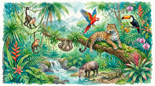© Andres Mejia, Naklejka premium Rainforest animals living in tropical jungle watercolor