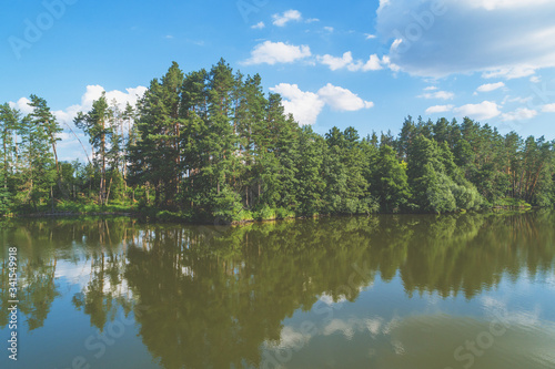 Fototapeta premium Rainforest, beautiful river in summer. Lakeshore with trees.
