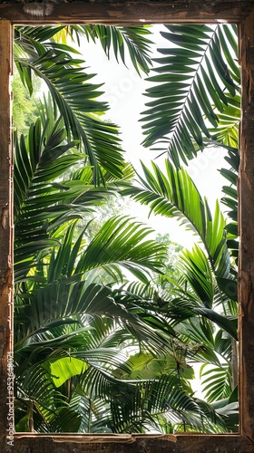 Fototapeta premium Rainforest canopy background with rustic wooden frame in tropical-themed...