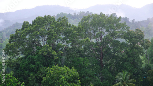 Obraz premium Raining over trees and greenery forest