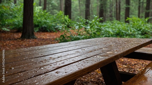 © Borasca, Naklejka premium Rainkissed wooden picnic table in tranquil forest setting during autumn