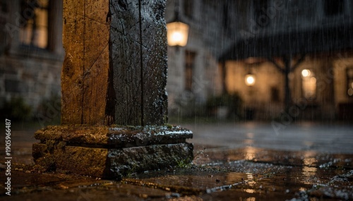 © Justlight, Fototapeta premium Rainsoaked heritage inn courtyard with a closeup of water droplets on rustic columns while softfocus lanterns cast a warm glow.