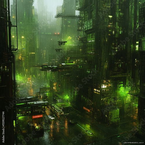 © Big9869, Naklejka premium Rainswept Cyberpunk Cityscape Glowing Green Metropolis