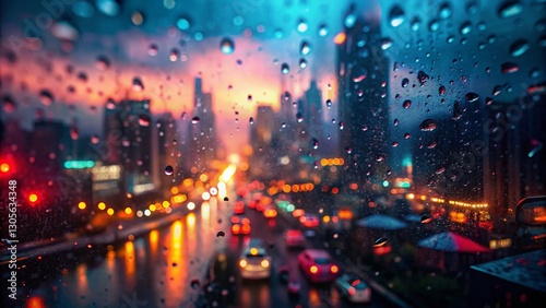 © Arnada, Fototapeta premium Rainy City Dusk: Drone View of Raindrops on Window, Blurred Headlights