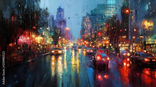 © Mega, Obraz premium Rainy city night street view through wet window.