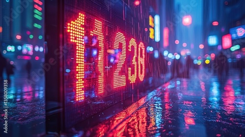 Obraz premium Rainy city night, vibrant LED display shows numbers reflecting on wet pavement