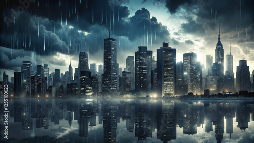 © Olga, Fototapeta premium Rainy city skyline at night with reflections