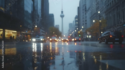 Naklejka premium Rainy City Street with Tower in Background - Realistic Photo