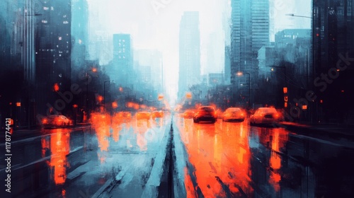 Fototapeta premium Rainy city traffic scene urban landscape digital art moody atmosphere high...