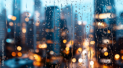 © Olha Havelia, Fototapeta premium Rainy cityscape background with blurred lights and skyscrapers visible through the window, creating an atmospheric and urban ambiance. High-resolution photography. Minimalist stock