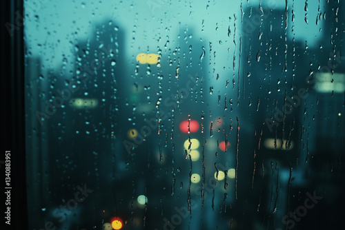 © Vilma, Obraz premium Rainy cityscape through a wet window with raindrops and blurred lights creating a moody urban atmosphere