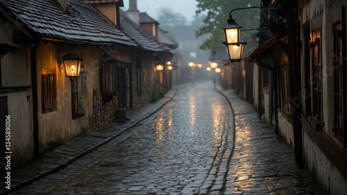 © Yopi, Fototapeta premium Rainy Cobblestone Street at Night with Gas Lamps