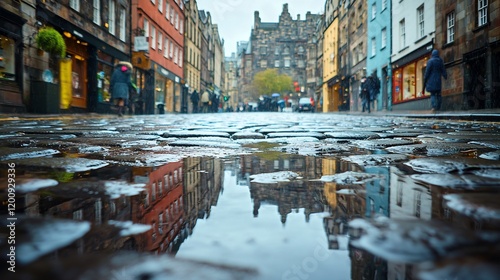© Tri, Fototapeta premium Rainy cobblestone street reflection in puddle.