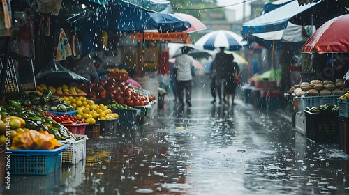 © nabisha, Naklejka premium Rainy Day at the Market People Under Umbrellas