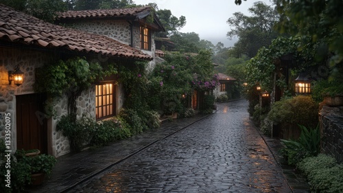 Obraz premium Rainy Day in a Quaint Stone Village