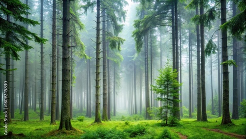 Naklejka premium Rainy day in a serene forest with misty fog and tall trees