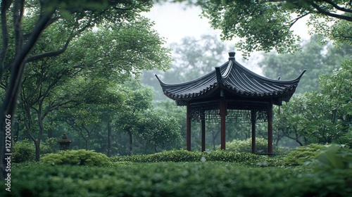 Obraz premium Rainy Day in a Tranquil Chinese Garden