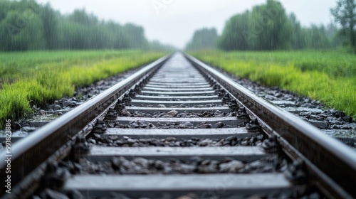 © OZTOCOOL, Fototapeta premium Rainy Day on Tranquil Train Tracks in Nature