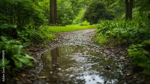 Obraz premium Rainy day, puddle ripples, green foliage path.