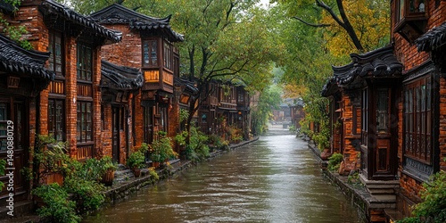 © Supriyati Pixxel, Fototapeta premium Rainy day scene of traditional Asian architecture lining a narrow canal. Lush greenery and reflective water
