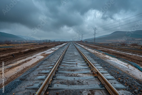 Fototapeta premium Rainy day view of a railway track under construction, extending towards a...