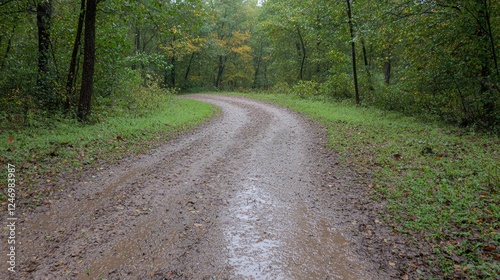 © BROPRADANA, Fototapeta premium Rainy day, winding forest road, autumn leaves