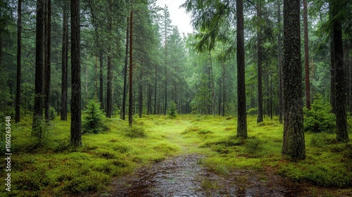Fototapeta premium Rainy Forest Landscape with Intense Downpour and Glistening Wet Vegetation...