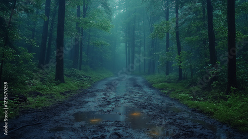 Obraz premium Rainy Forest Path, Dark Green Woods