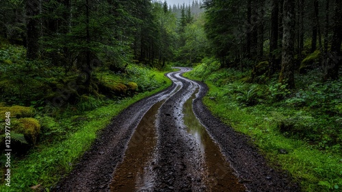 © BROPRADANA, Fototapeta premium Rainy forest road curves through lush greenery (1)