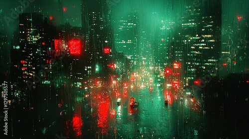 Obraz premium Rainy futuristic city at night, neon lights, green and red.