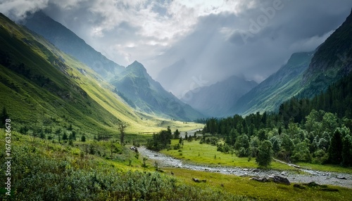 © Juana, Fototapeta premium rainy mountain valley morning