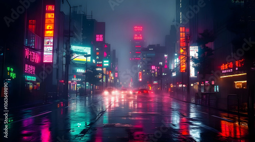 © Siasart Stock, Fototapeta premium Rainy Neon City Street Illustration
